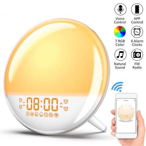 APP 제어 led 다채로운 조명 알람 시계 일출 모닝콜 wifi 음성 지능형 수면 웨이크 업 조명 FM 라디오